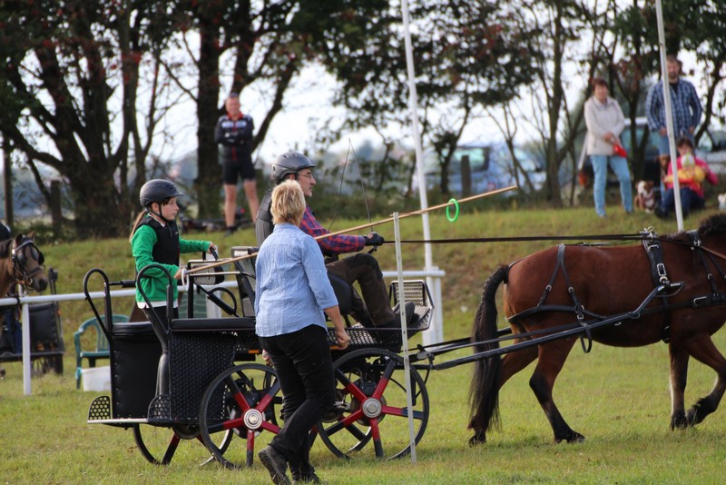 Nach der Mittagspause waren dann wieder die Fahrer am Start. Als erstes fand der Wettbewerb im Hindernisfahren statt, dessen Wertung in den WBO-Fahrercup 2018 eingeht. Hier siegten in der Abteilung Einspänner Ponys Anastasia Drowatzky mit Daisy, in der Abteilung Einspänner Großpferde Anke Pötzschke mit Carino, in der Abteilung Zweispänner Ponys Stefan Liebers mit Toffifee und Zuckerpuppe und in der Abteilung Zweispänner Großpferde Thomas Pischel mit Samorah und Tuvan. Danach ging es beim letzten Wettbewerb wieder um Geschwindigkeit und Geschicklichkeit. Diesmal mussten die Beifahrer „ritterliche“ Fähigkeiten zeigen und mit einer Stange von der an den aufgestellten Ständern vorbeifahrenden Kutsche aus Ringe aufnehmen.